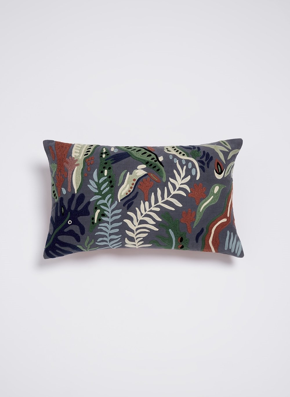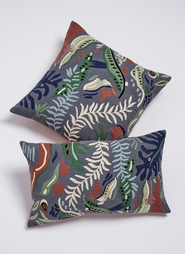 A Almofada Deep Sea da Le Lis Casa possui estampa de folhagens marítimas é confeccionada em algodão e lã acrílica, possui formato retangular e zíper na parte traseira da peça.
